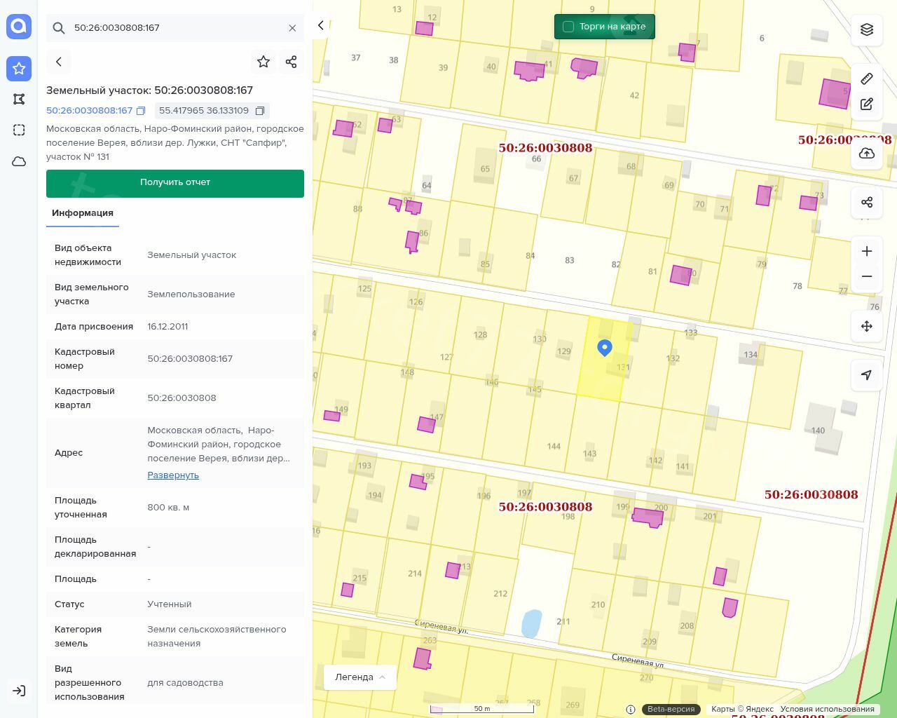 Земельный участок: кадастровый номер: 50:26:0030808:167 Назначение объекта недвижимости: данные отсутствуют Виды разрешенного использования объекта недвижимости: для садоводства, площадь: 800 +/- 20 м2